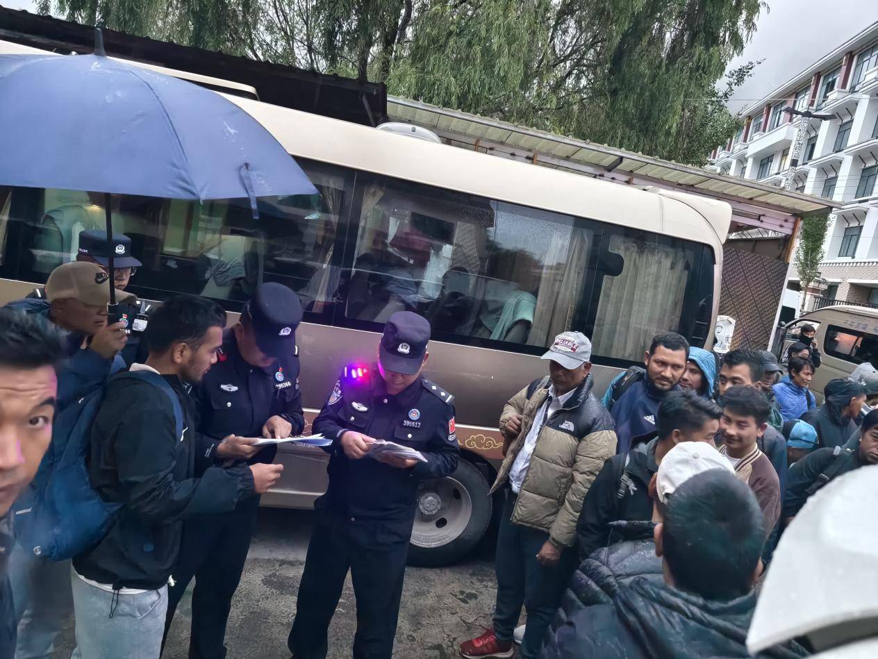 格桑次仁与民警为尼泊尔边民登记信息,边民有序配合。受访者供图