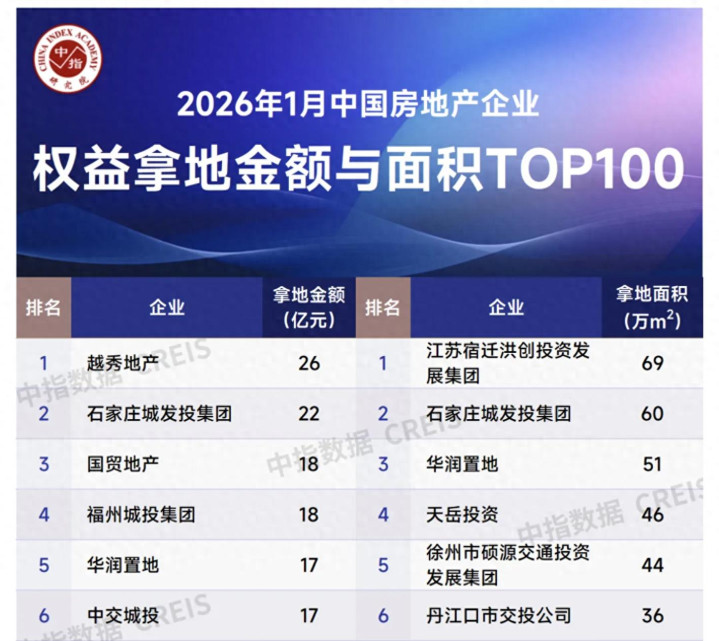 乐居财经 吴文婷1月30日,中指研究院发布2026年1月全国房地产企业拿地TOP100排行榜。2026年1月,TOP100企业拿地总额579.9亿元,同比下降52.1%。