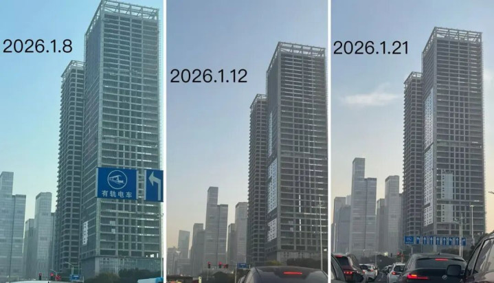 项目C区公寓早已交付,谁料开发商暴雷B区办公停工3年多,去年下半年B区两栋200米甲级写字楼悄然复工,期间断断续续。最近有网友发现,办公楼建设加速,玻璃幕墙短短十几天安装了不少层。据计划,这两栋楼预计2027年底完工。