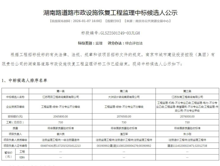 近日,官方发布了湖南路道路市政设施恢复工程监理中标结果,江苏雨田工程咨询集团有限公司中标人,这也意味着,为期2年的湖南路改造,即将拉开帷幕。